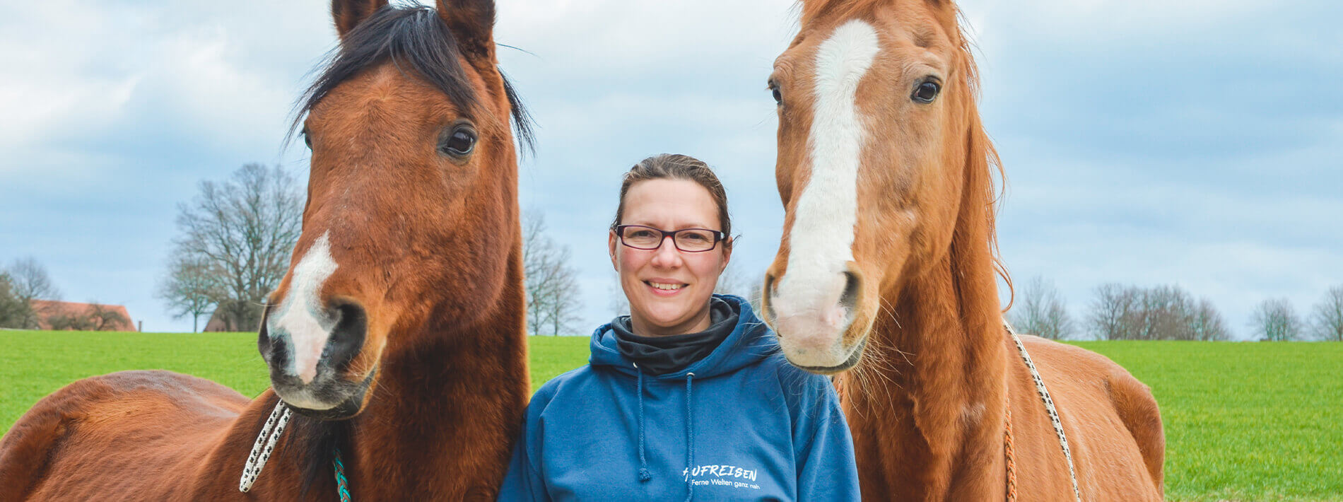 Meine große Liebe gilt der Geländereitere. Sie bietet mir nicht nur optimale Trainingsmöglichkeiten für Muskelaufbau, Kondition und durchaus auch für die ein oder andere Dressurlektion und somit für Gymnastizierung, sondern beschert mir ein unglaubliches Gefühl von Freiheit. Im Gelände, gerade auch bei Wanderritten, steht man so schnell vor ungewohnten oder neuen Herausforderungen: Einer Baustelle, eine mit Kreide bemalte Straße, einer Brücke usw. Gute Vorbereitung und eine gute vertrauensvolle Beziehung zwischen Mensch und Pferd sind die Grundlage, um all dies zu meistern. Bodenarbeit ist die Grundlage, auf der ich alles aufbaue. Sie hilft mir auch und gerade im Gelände, wenn sich Situationen ergeben, die sich vom Sattel aus nicht oder nur schlecht lösen lassen würden. Am Boden kann ich spielerisch und abwechslungsreich unsere Kommunikation verfeinern, unsere Beziehung vertiefen und das gegenseitige Vertrauen festigen. Bodenarbeit muss nicht auf dem Platz stattfinden. Es gibt so viele Orte, die sich zum Training anbieten. Das kann schon die wehende Folie eines Silage-Ballens beim Bauern nebenan sein. Eine weitere Leidenschaft von mir ist das Handpferdereiten. Nach guter Vorbereitung am Boden macht es nicht nur unglaublichen Spaß, sondern ist auch unheimlich praktisch, um zwei Pferde gleichzeitig zu bewegen. Man kann sowohl Jungpferde oder Pferde, die noch überhaupt keine Geländeerfahrungen haben auf diese Weise an alles heranführen, als auch Senioren auf eine schöne Runde mitnehmen. Auch ein Packpferd beim Wanderritt kann so eingesetzt werden. Für mich persönlich ist es aber einfach auch ein unglaublich schönes Gefühl zu erleben, dass mir gleich zwei Pferde so vertrauen und unsere Kommunikation so gut ist, dass wir uns gemeinsam allen Herausforderungen stellen können. Dabei ist es ganz egal, ob es sich um Dressurarbeit zu dritt handelt, oder um einen flotten Galopp auf dem Stoppelfeld, ob wir über Brücken reiten oder gemütlich einen Waldweg entlang schlendern. Bei allem Spaß, den meine Trails euch und euren Pferden bereiten sollen, geht es auch darum genau diese Beziehung zu vertiefen und damit eine Grundlage zu schaffen, um alle Herausforderungen gemeinsam und vertrauensvoll anzugehen.