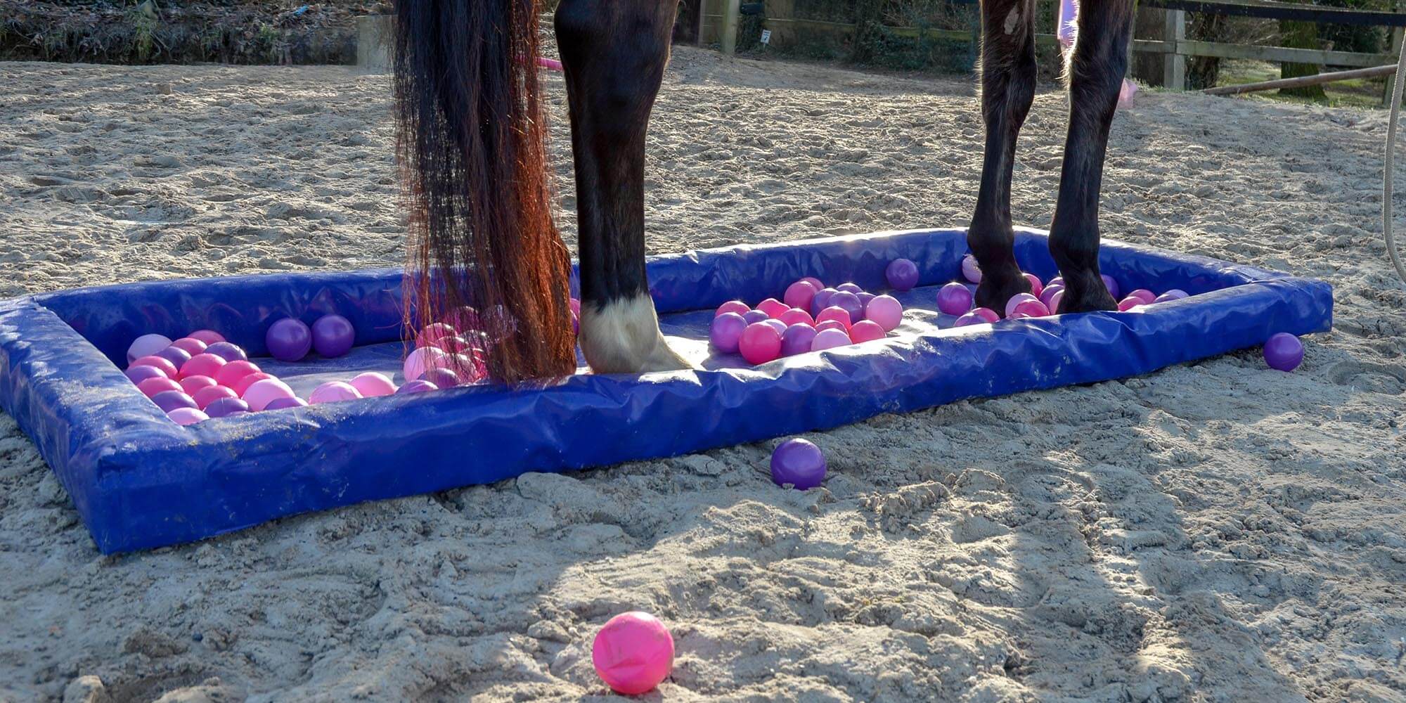 Das Bällebad kann in 2 Richtungen durchquert werden. Beginne zunächst mit der kürzeren Strecke. Manche Pferde versuchen, diesem ungewohnten Untergrund zu entgehen, indem sie darüber springen. Dann lass dein Pferd zunächst ausgiebig schnuppern und frage mit ganz wenig Energie nach einem kleinen Schritt. Geht dein Pferd mutig und gelassen beide Richtungen und bleibt auch in den Bällen stehen, kannst du auch nach dem Passieren im Trab fragen. Rückwärts in die Bälle zu gehen, über die kleine Kante hinweg, ist eine große Herausforderung. Sei dir dessen bewusst, falls du danach fragen möchtest.