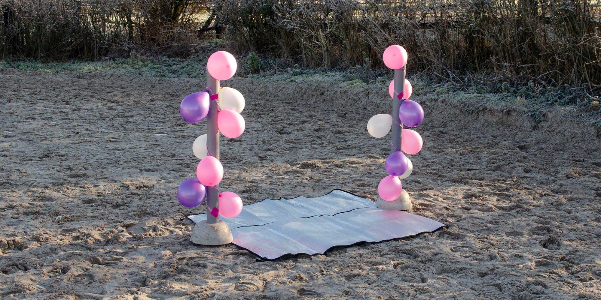 Den muss auch dein Pferd sich erstmal trauen. Dabei kannst du ihm helfen, indem du z.B. zunächst den glitzernden Alu-Untergrund weglässt und das Luftballon-Tor etwas breiter stellst. Da sich die Ballons im Wind bewegen, verändert sich dieser Durchgang für dein Pferd immer wieder. Lass es zunächst im Schritt passieren, versuche es dann zwischen den Ballons anzuhalten und auch rückwärts zu richten. Wenn das gelassen klappt, kannst du die Schwelle natürlich auch schneller überschreiten.